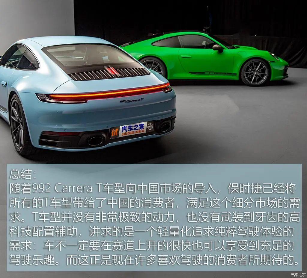 随着保时捷911 992 Carrera T车型向中国市场的导入,保时捷已经将所有的T车型带给了中国的消费者,满足这个细分市场的需求。T车型并没有的动力,也没有武装到牙齿的高科技配置辅助,讲求的是一个轻量化追求纯粹驾驶体验的需求:车不一定要在赛道上开的很快也可以享受到充足的驾驶乐趣。而这正是现在许多喜欢驾驶的消费者所期待的。
