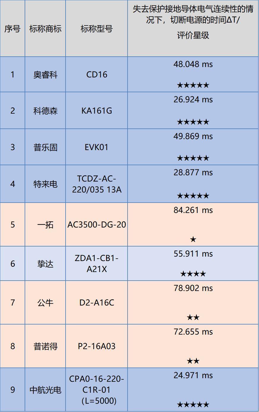 本项测试依据标准对样品进行保护接地导体连续性的持续监测项目的测试,在失去保护接地导体电气连续性的情况下,便携式充电枪应在100ms(毫秒)内切断电源。本项测试根据样品在失去保护接地导体电气连续性的情况下切断输出电源的时间进行比较测评。