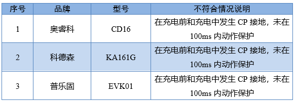 本次测试结果中,有3款样品CP接地测试不符合标准要求。在充电前和充电中发生CP接地,未在100ms内动作保护。分别为奥睿科CD16、科德森KA161G以及普乐固EVK01。