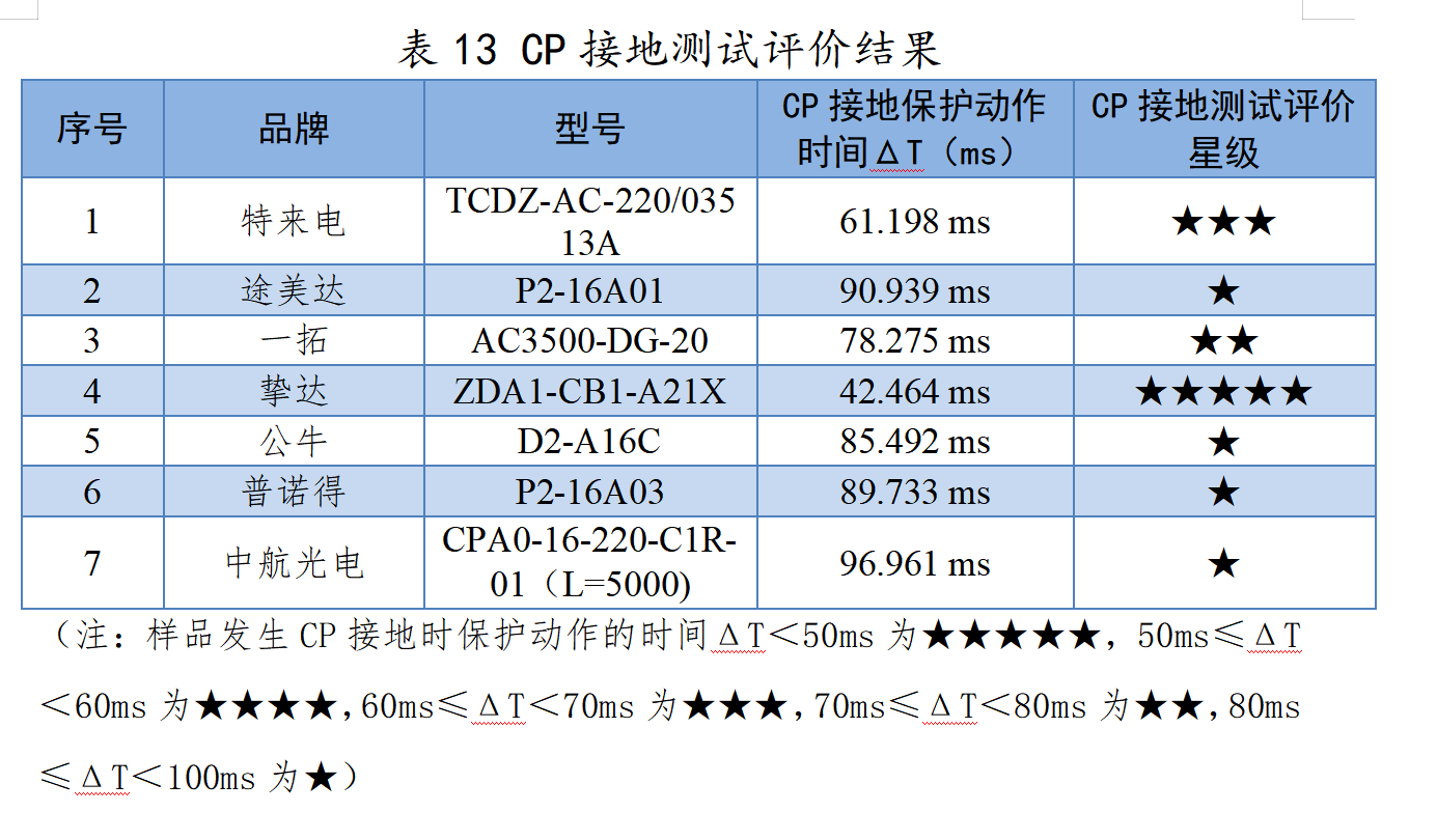 另外有2款样品的CP接地保护动作时间超过90ms,临近测试标准时间,分别为途美达P2-16A01耗时90.936ms,中航光电CPA0-16-220-C1R-01(L=5000)耗时96.961ms。