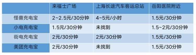 以怪兽充电宝为例,选取上海来福士广场、上海长途汽车客运总站和岳阳医院附近等人流量较大区域发现,怪兽充电宝在上海长途汽车客运总站外两家相距几十米的店铺内,计费价格分别为每小时4元和每小时5元;在来福士广场同一楼层相距几十米左右,两家设有怪兽充电宝的收费价格分别为每30分钟2元和每30分钟2.5元。