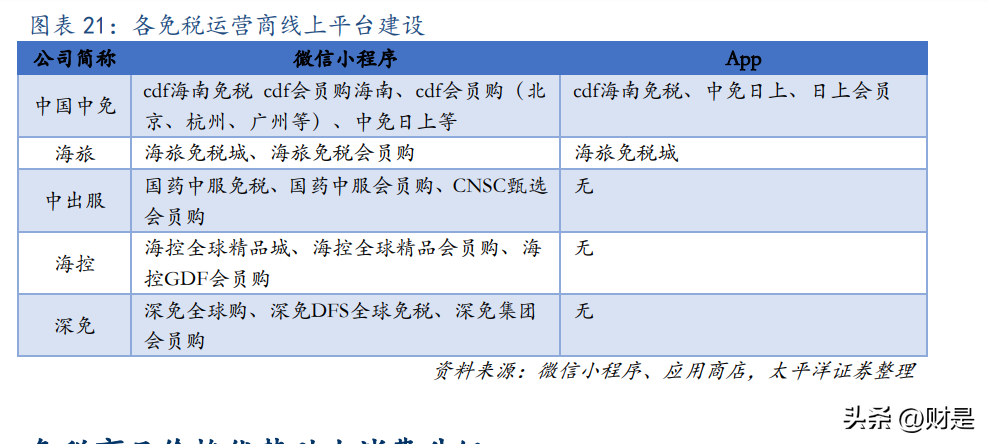 线上销售为消费者带来便利性。线上平台包括两种服务,一是免税线上预定+线下提货,二是 线上有税直邮。在疫情之前,海南离岛免税已经上线了三亚/海口免税线上预约+机场提货等服务。 受疫情的影响,我国出入境免税业务下降,同时海南离岛免税阶段性关店。在这种情况下, 中免积极布局电商业务,依托海南离岛免税政策的支持,扩大电商销售,分别开发离岛免税线上 预定小程序“cdf 海南免税”和离岛补购小程序“cdf 会员购海南”。中免的线上店铺还设有北京、 上海、杭州等多个渠道可选。中免将多个会员体系整合为统一综合会员体系,推进线上平台一体 化建设。