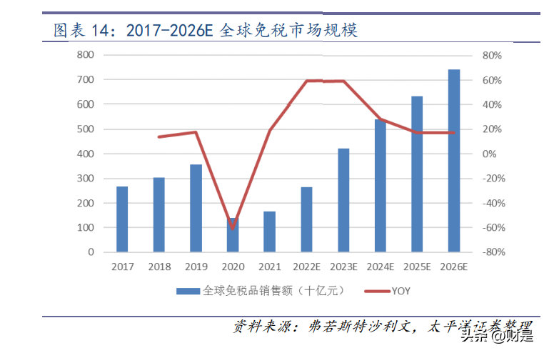 免税市场稳步发展。19 年免税市场规模为 3577 亿元,17-19 年 CAGR 为 15.8%。2020 年受新冠疫情影响,免税市场受到严重冲击,销售额降至 1400 亿元。各国采取措施刺激免税市场 发展,中国放松离岛免税购物限制,韩国推动大客户直邮,上调免税限额,此类措施均可为免税 品市场后续增长提供动力。据弗若斯特沙利文,预计免税市场规模将于 2026 年达 7437 亿元。