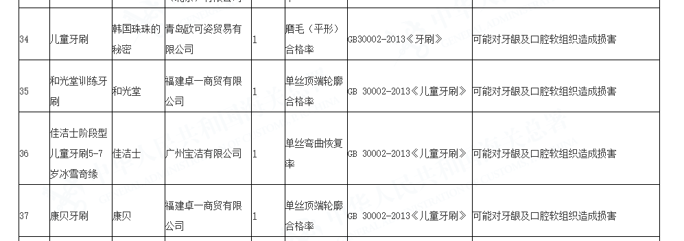 其中,一批次产品名称为“佳洁士阶段型儿童牙刷5-7岁冰雪奇缘”、品牌为“佳洁士”、进口商名称为“广州宝洁有限公司”的进口儿童牙刷产品不合格,不合格项目为“单丝弯曲恢复率”,涉及标准“GB 30002-2013《儿童牙刷》”,不合格风险为“可能对牙龈及口腔软组织造成损害”。