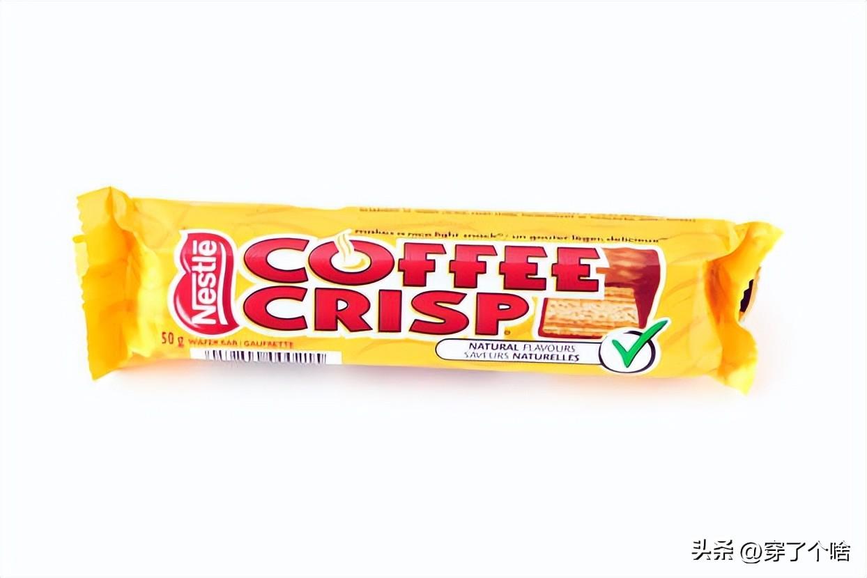 Coffee Crisp, 加拿大与Kit Kat在质地上相似,这种咖啡脆片是一种由咖啡奶油、层层酥脆的威化饼和薄巧克力涂层制成的小吃。它是在多伦多的雀巢工厂生产的。
