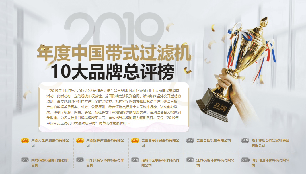 “2019年中国带式过滤机10大品牌总评榜”是由品牌中网主办的行业十大品牌民意调查活动,此活动有一定的规模和性,范围影响力涉及到全网。活动始终坚持公开透明的原则,设立监测监督机构并进行全时段监控。机构将全网数据和民意调查进行整合分析,产生的数据秉承真实、时、公正原则,综合评选出行业十大品牌排行榜。