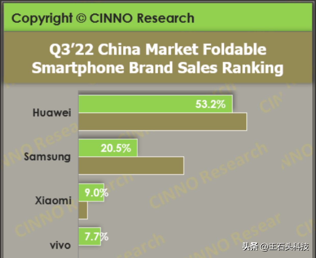 而在折叠屏手机市场上,华为成为了大赢家,份额高达53.2%,占据折叠屏手机市场过半份额,同比增长95%。