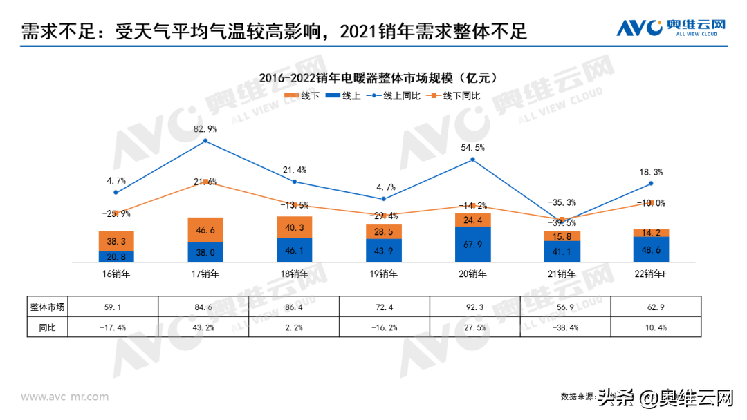 电暖器2021销年已经结束,因天气变暖、暖气覆盖率提升、产品同质化严重以及相似功能竞品快速发展等原因,市场需求严重不足,行业发展面临严峻的局面,根据奥维云网(AVC)全渠道推总数据,2021年9月至2022年2月电暖器市场规模56.9亿元,同比下降38.4%,其中线上市场41.1亿元,同比下降39.5%,线下市场15.8亿元,同比下降35.3%,为近几年来严峻表现,市场呈现如下特征: