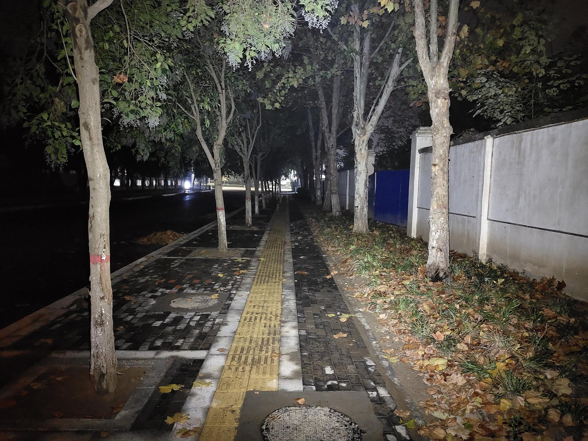 晚上夜跑,整条道路上一片漆黑,瞬间点亮头灯后,远近光模式下750流明的亮度足以周遭视野一片通明。随着脚步移动时,道路前方及两旁均能照顾到。铺路果还是很出色的。