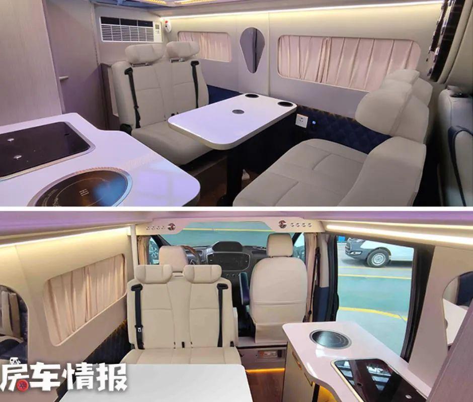 车内的设计也比较有看点,提供了两套不同的设计方案,分为5座版本和6座版,其中5座版,采用3+2的座椅布局方式,生活区两张独立单人座椅,长途乘坐更舒适,后方则是一张纵置床,算上车顶双人床,根据以往经验4个人睡稍稍有点挤,2-3人;