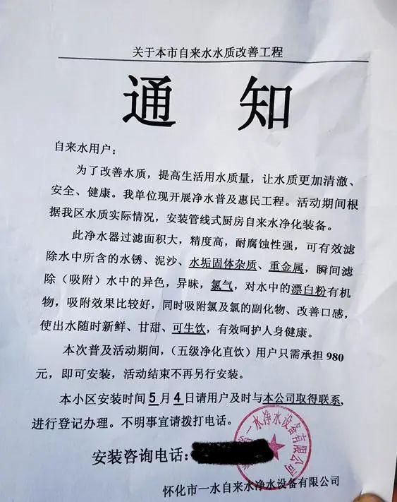 有人说美的笫一,我说不可能,不专业,不敬业,空调没有格力的好,豆浆机没有九阳的好,海尔没有新飞冰箱的好,净水器也想站市场,那有威世顿,沁园,安吉尔的专业,一边站站,用皮股想想,都知道了队某频久,我家安装的就是威世顿的产品早些时候,媒体就报道了有相关企业假冒水厂以改良自来水水质为由头,推销净水器的通知。现在这样的通知也随之来到怀化了,请大家注意甄别。近日,怀化市民朋友发现,在某些小区出现了标题为《关于本市自来水水质改良工程的通知》,通知是以怀化市一水自来水净水设备有限公司的名义张贴的。刚刚(2022年5月6日),怀化市水务投资集团有限公司发布声明,声明表示,以自来水水质改良惠民工程的名义,推销净水设备的现象在全国各地已多次出现,徐州日报社的都市晨报在2021年12月10日的专题新闻中报道类似机构涉嫌“单位虚构、私刻公章、非法经营、销售假冒伪劣产品”等行为。为此,怀化市水务投资集团有限公司特别发布声明提醒,请市民朋友注意鉴别。如遇类似现象或有其他疑问,可拨打24小时水务热线询问了解。