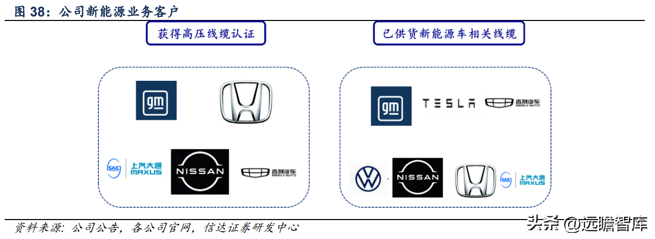 公司不断拓展新能源业务,业绩有望随主要客户销量共振。在新能源车领域,公司已取得通用、本田、日产、上汽大通、吉利等多家主机厂得高压线缆认证,并已向大众、日产、通 用、本田、上汽大通、吉利、特斯拉等厂商供应与新能源汽车相关的汽车线缆产品。公司不 断推进新能源业务,销量有望继续提升。