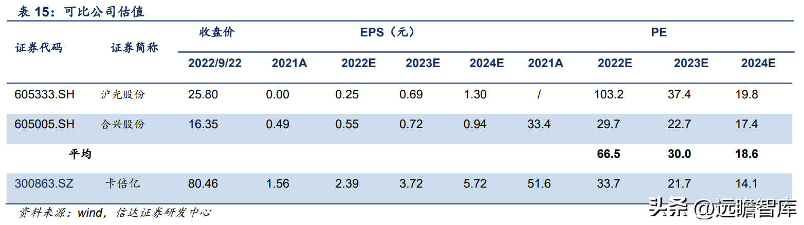 我们预测公司2022年-2024年归母净利润为1.3亿元、2.1亿元、3.2亿元,同比增长52.6%、 55.7%、53.9%,对应 EPS 为 2.39、3.72、5.72 元,PE 为 33.7/21.7/14.1 倍。参考可比公司估值水平,给予公司 2023 年 30 倍目标 PE,对应目标价 111.6 元。