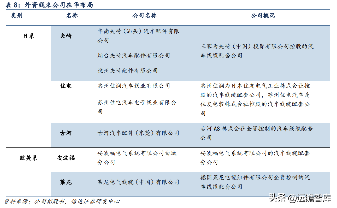 外资企业如矢崎、住电、安波福、莱尼等在华的线缆厂布局地点较为单一,古河线缆厂地点 为东莞、安波福线缆厂布局在白城,住电线缆厂分布于惠州和苏州,矢崎线缆厂较多,分别 位于汕头、烟台和杭州。