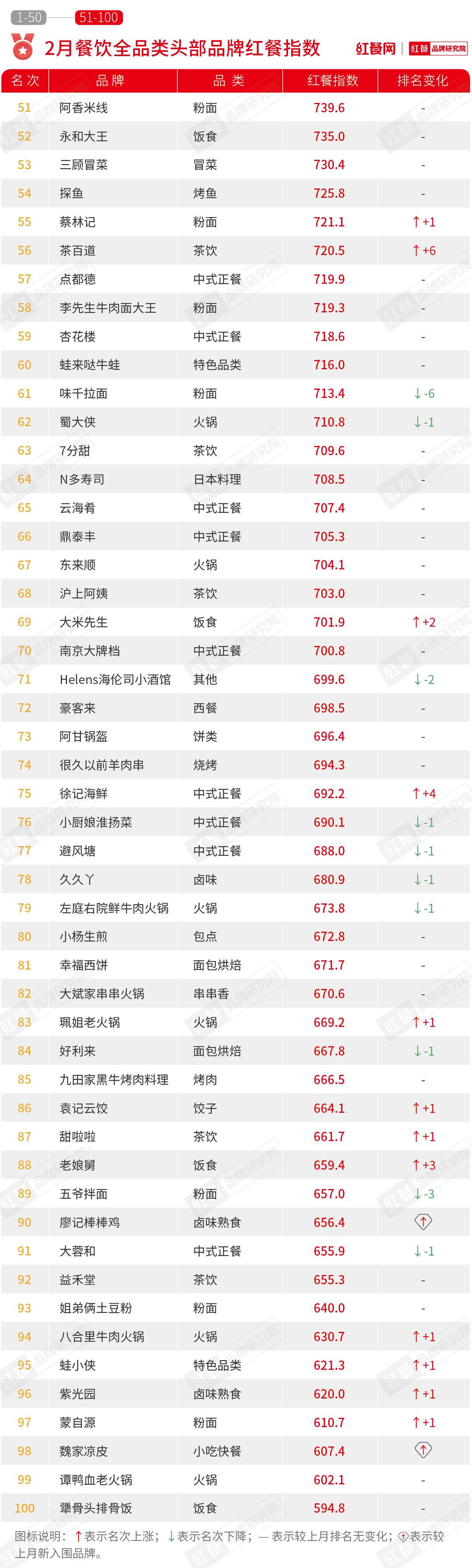 2月,有部分品牌因为食品、裁员等负面消息频发,红餐指数有所下行,榜单排名也随之下滑,例如文和友等品牌。