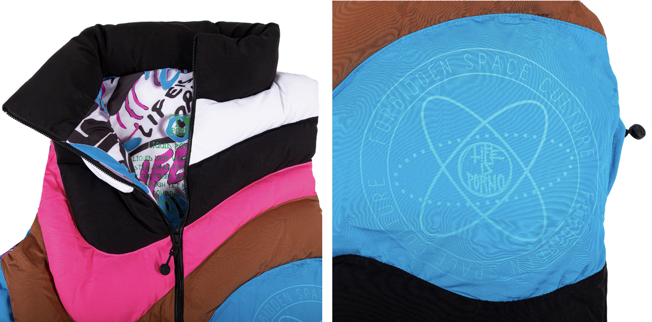 这款马甲以不规则的几何线条将衣身分割成多个区域,并用不同撞色色块加以区别,流线型的弧度外观,充满了视觉张力。下方的色块区域注入品牌的标志 Logo,内衬则采用了满版的涂鸦字体和印花设计,表达了随性自由的街头美学。