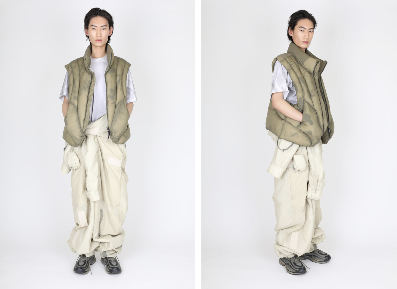 这件来自品牌 21 秋冬系列的马甲,具备双面穿着功能,在户外卡其色的加持下,点缀一些类似泼墨的元素,彰显前卫色彩。正面的弧线压线设计让人眼前一亮, 而反过来穿,你会发现夹克两侧附加上了机能绑带,绑带上挂有抽绳和小包,实用性十足。一面是时尚风格,一面则主打机能实用主义,真正的一衣两穿。