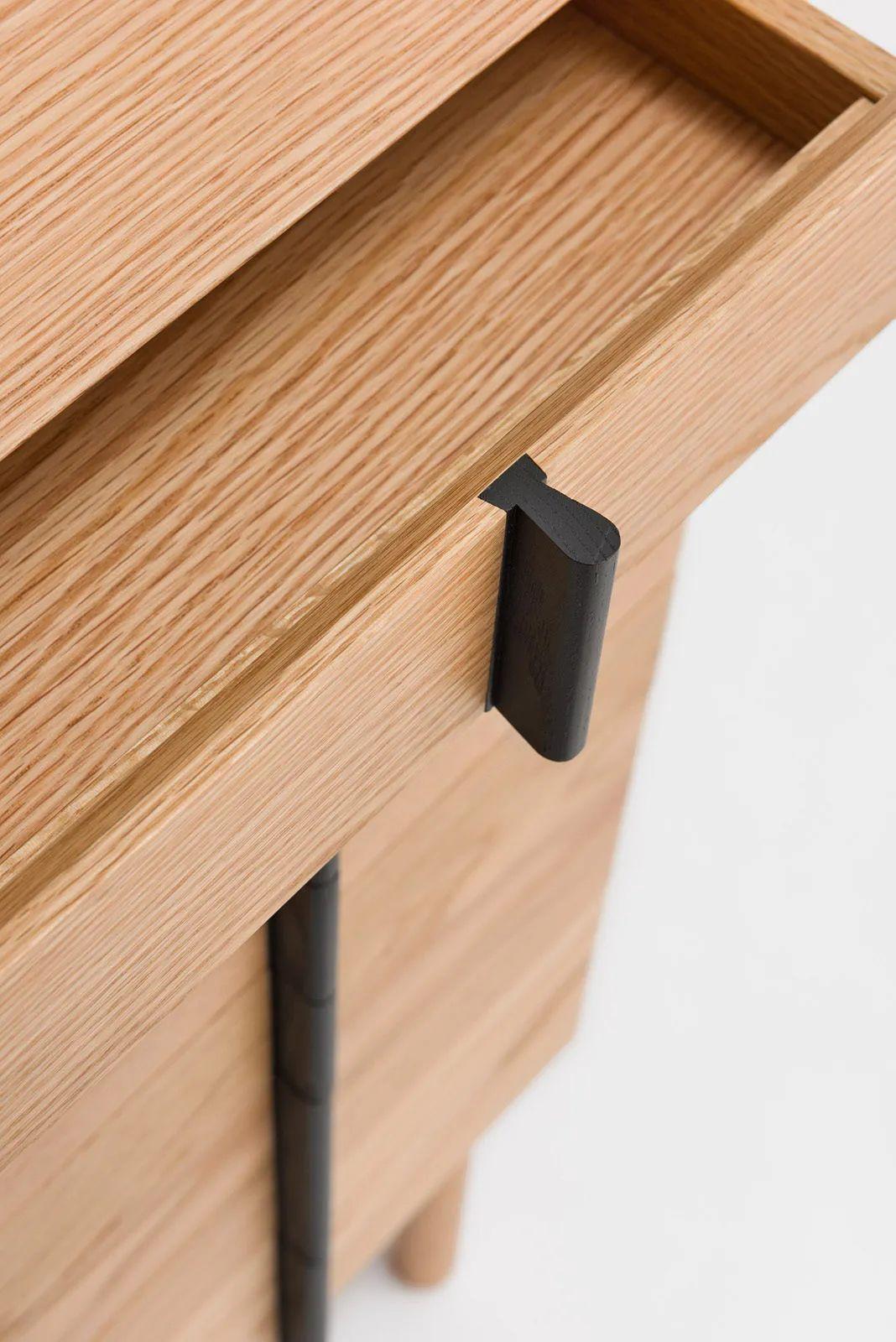 这款柜子的特别之处在于它的抽屉手柄部分,通过燕尾榫连接。当所有抽屉都关闭时,手柄垂直对齐形成一条直线。
