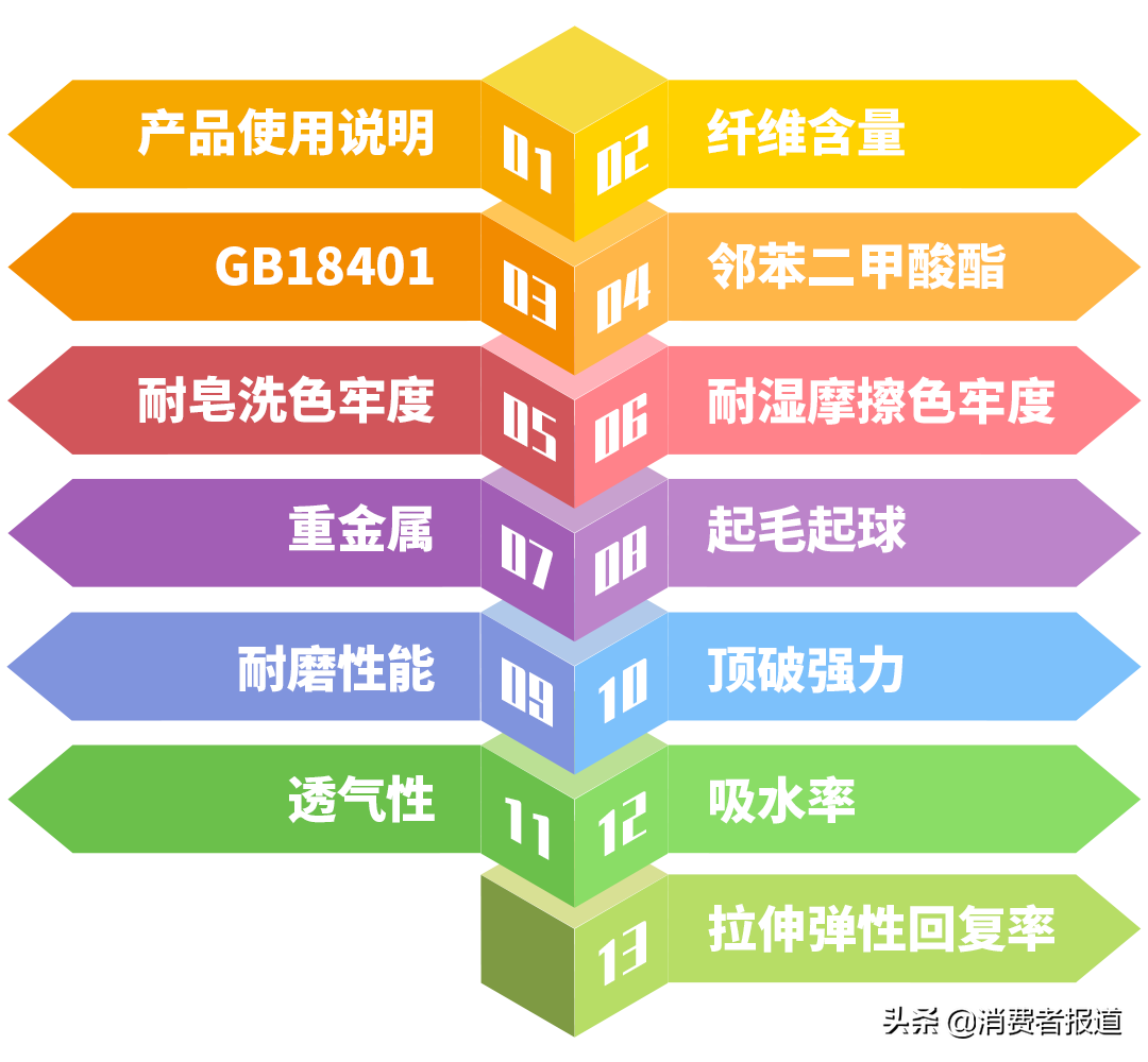 二、检验标准及项目比较试验依据GB18401-2010 《纺织产品基本技术规范》、GB/T 5296.4-2012 《消费品使用说明第4部分纺织品和服装》、GB/T 29862-2013《纺织品纤维含量的标识》、GB/T 8878-2014《棉针织内衣》、FZ/T 73024-2014《化纤针织内衣》、明示的产品标准及相关质量技术指标,对样品产品使用说明、纤维含量、GB18401、耐湿摩擦色牢度、耐皂洗色牢度、邻苯二甲酸酯、重金属、起毛起球、耐磨性能、顶破强力、透气性、吸水率、拉伸弹性回复率项目进行了测试。