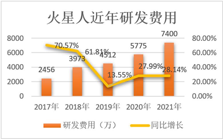 除了在市场布局、智能制造上的投入,火星人在产品研发上也始终高度重视,投入大量资源、坚持自主研发。根据2021年火星人年度财报,研发费用为7399.6万元,同比增长28.14%。