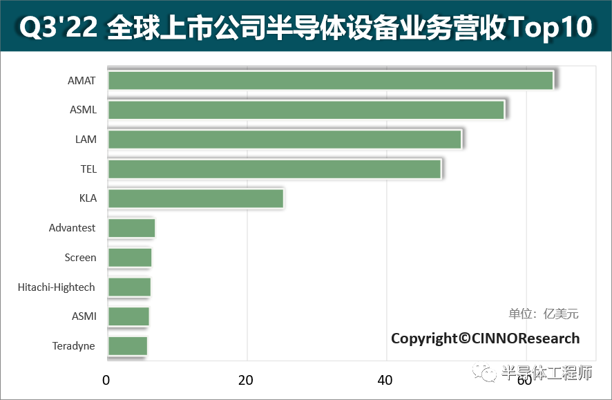 22上市公司半导体设备,第三季度前10排名营收合计达275亿美元,同比增长8.6%,环比增长14.9%。