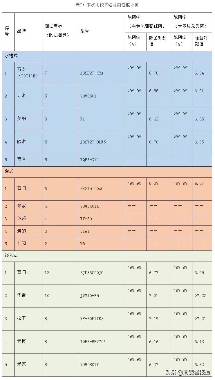 本次比较试验中,全部测试样机均明示具有除菌功能,但“水槽式”产品中序号为5及“台式”产品中序号为2、3、4、5的样机因内部空间问题,无法按照QB/T 5133-2017标准的要求摆放规定数量和类型的标准欧式餐具,故上述样机未进行除菌性能测试。