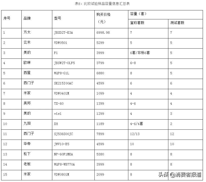 测试结果显示,洗碗机对水、电的消耗程度与洗碗机容量(套数)有直接关系,套数较多的产品,在对水资源和电能的利用上更有优势。