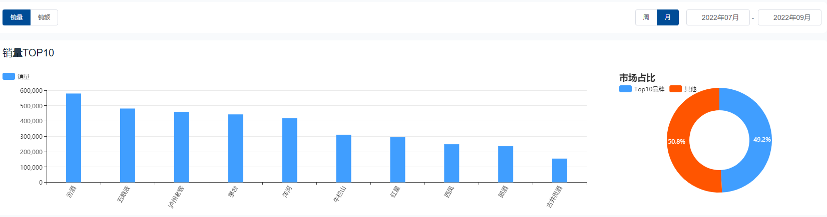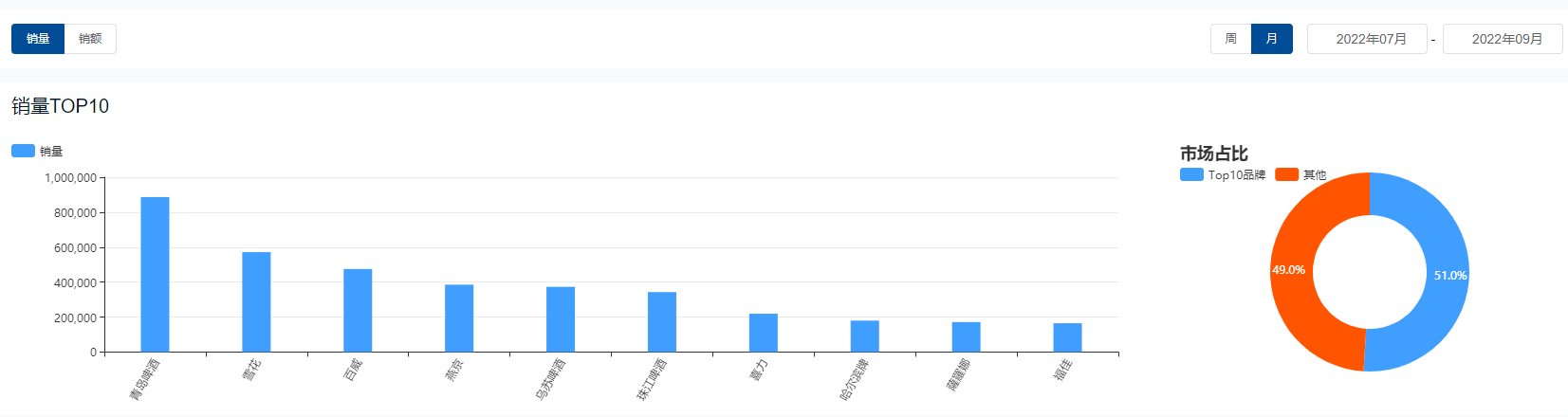 不过从热销商品也能看出,啤酒市场整体集中度并不高,TOP10款热销品中包含了9个品牌。