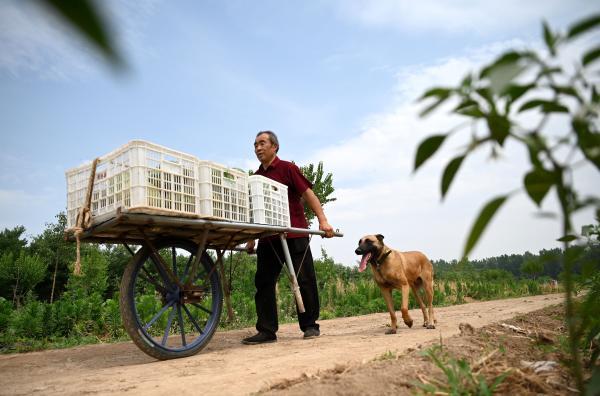 ↑6月16日,在河北省邯郸市丛台区招贤村,张静修搬运刚采收的西瓜,爱犬“图图”在旁陪伴。新华社发(郝群英摄)