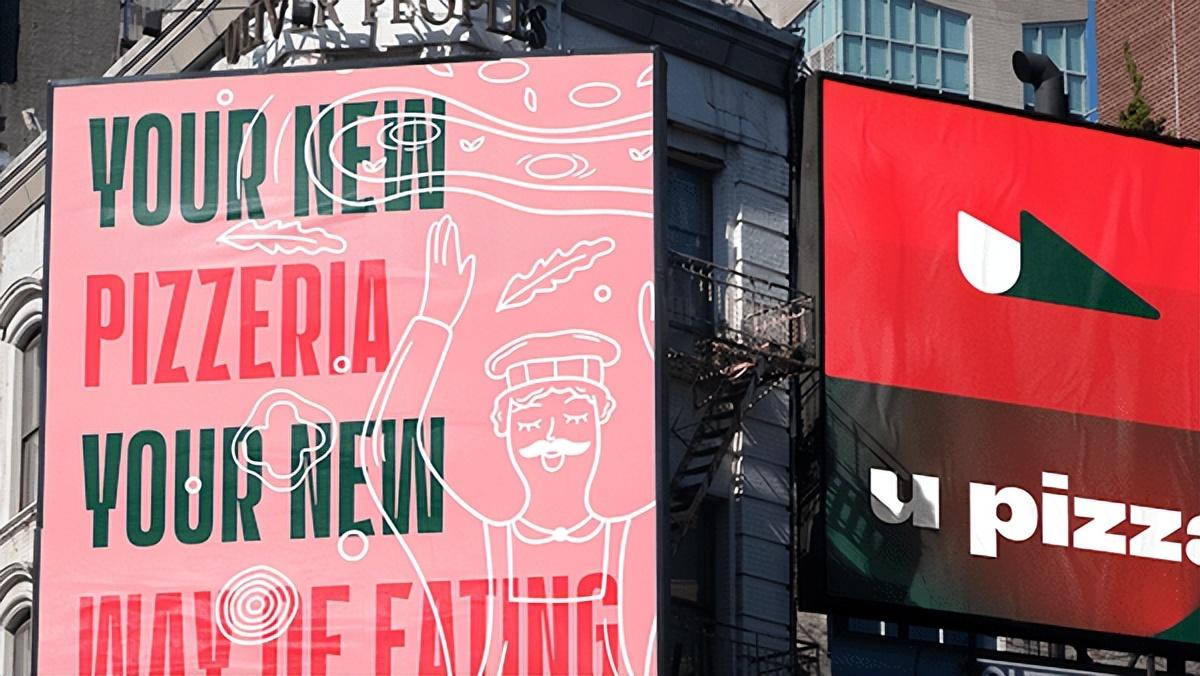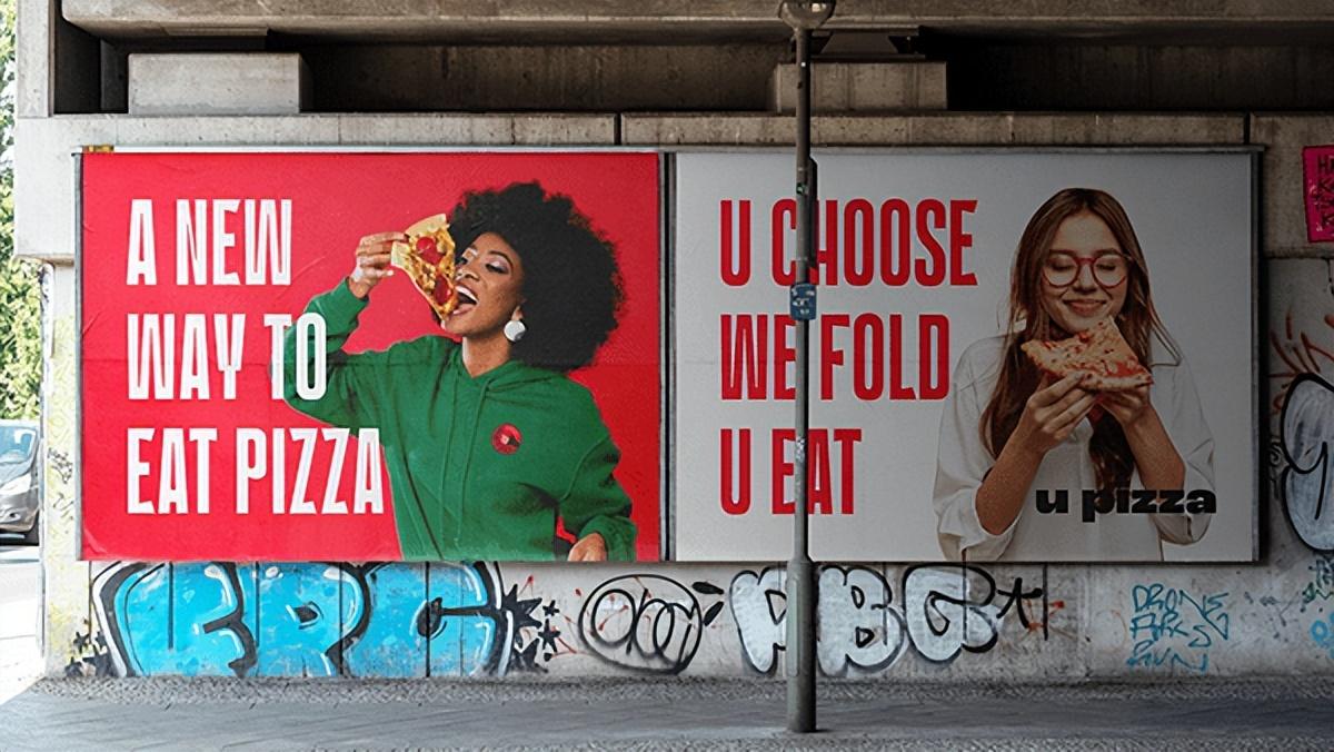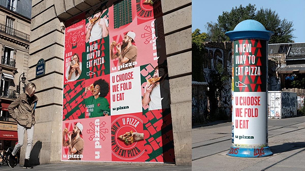 U Pizza 是一家披萨店,摆脱了披萨是圆形或者切片的传统观念,U Pizza 的理念是,将切片折叠好提供给顾客,品牌名字也来源于此。品牌视觉将U形概念应用在logo及物料之中,并配合大胆活泼的色彩,为品牌带来力量感,增强差异化。