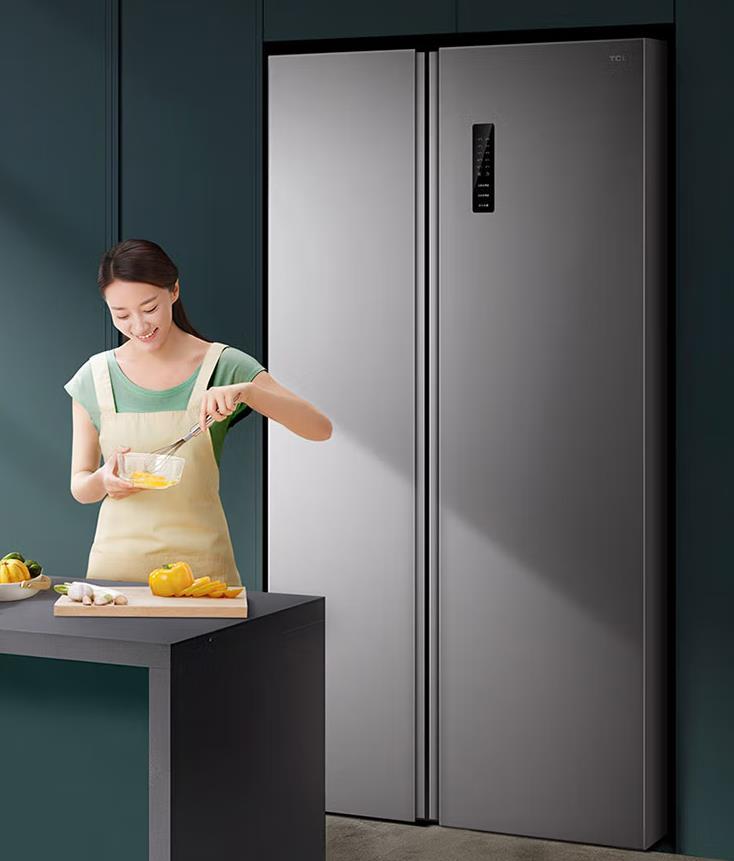 比如TCL的455升V3系列超薄对开门冰箱,价格还不到2200元。面板做工很好,有全触控显示屏,可以调节温度的,操作方便。