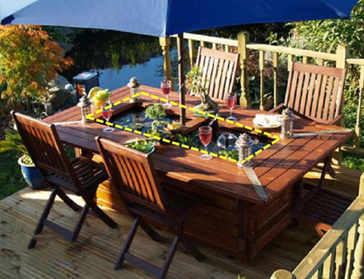 请木工做特别的户外餐桌,在餐桌中间位置,内嵌掏空,周围做防水,灌满水,放入鱼儿,在庭院就餐,还有鱼儿相伴,有趣又温馨。