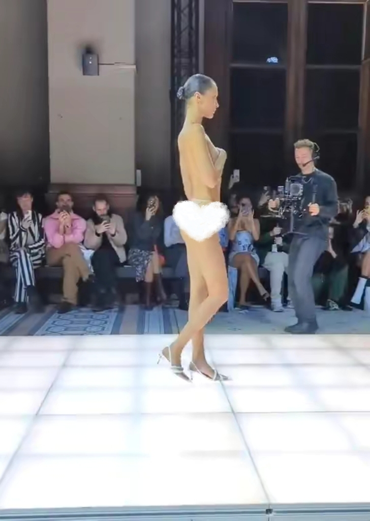 模特胸前仅用了两块薄薄的布料遮挡,透明的绑带若隐若现,可以说将“尺度”发挥到。