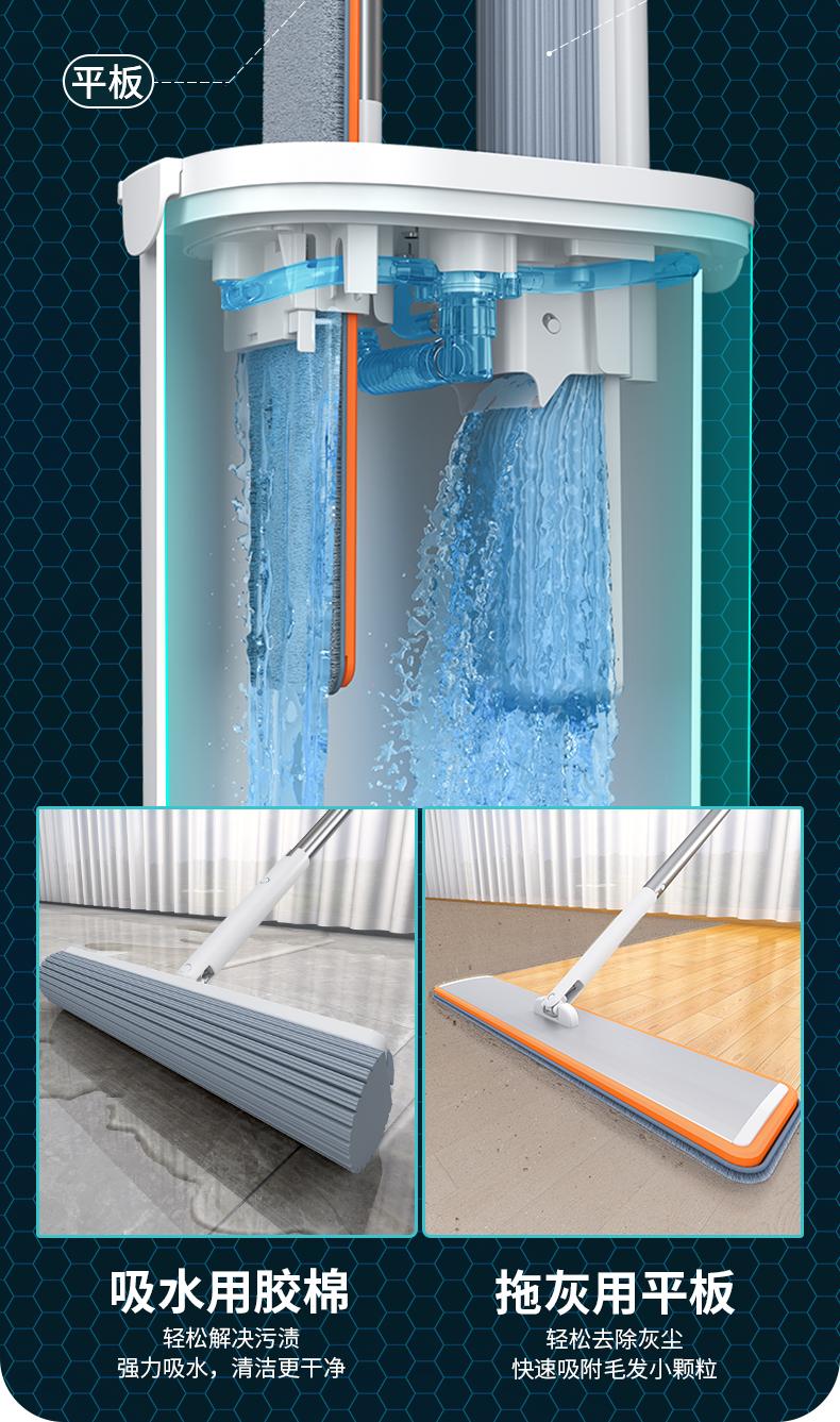 这种拖把我认为是在自洁拖把上做了升级,一个拖把桶同时收纳平板拖把和胶棉拖把,买一个就可同时满足干拖和湿拖,性价比相对较多。