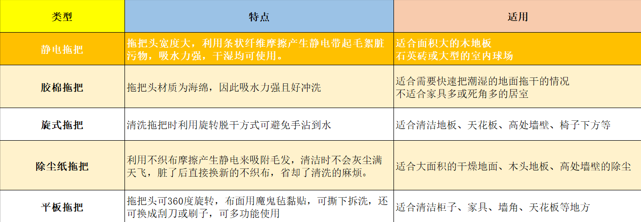 扔过20把拖把的我,面对这道题倒是有些经验可以跟大家分享下,为了避免长篇大论,我将以前用过的几种拖把的特点做了个整理,可以先了解,我们再展开讲讲,家用拖把到底该如何选?