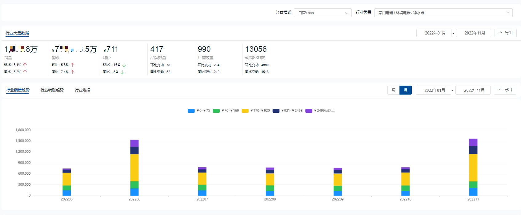 2022年在净水器领域小米品牌整体销售成绩,全年总销量超247万件,总销售额超11亿元。今年11月份,小米的销售成绩达到全年高,单月销量将近41万件,销售额超2.4亿元。目前在京东平台上,小米净水器的相关店铺共48家,每个月动销sku数量共631个。