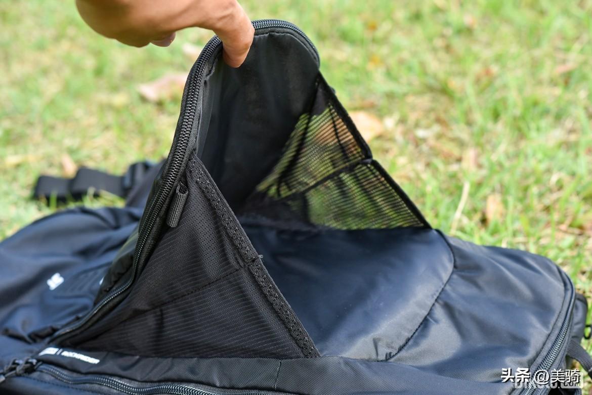 ▲背包具有一个多功能工具仓,内有多个网袋隔层,外侧口袋带有防水拉链,可以保护重要物品