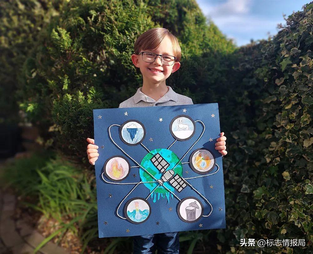 卡勒姆用画笔描绘了一颗绕蓝色地球运行的卫星,白色的卫星轨道上有六个不同主题的插图。从左上角开始依次为冰山、北极熊、温室应(一个橙色地球和一个温度计)、垃圾处理、冰川融化和一团火焰。这些图案代表了卫星技术在监测和应对气候变化中的作用。