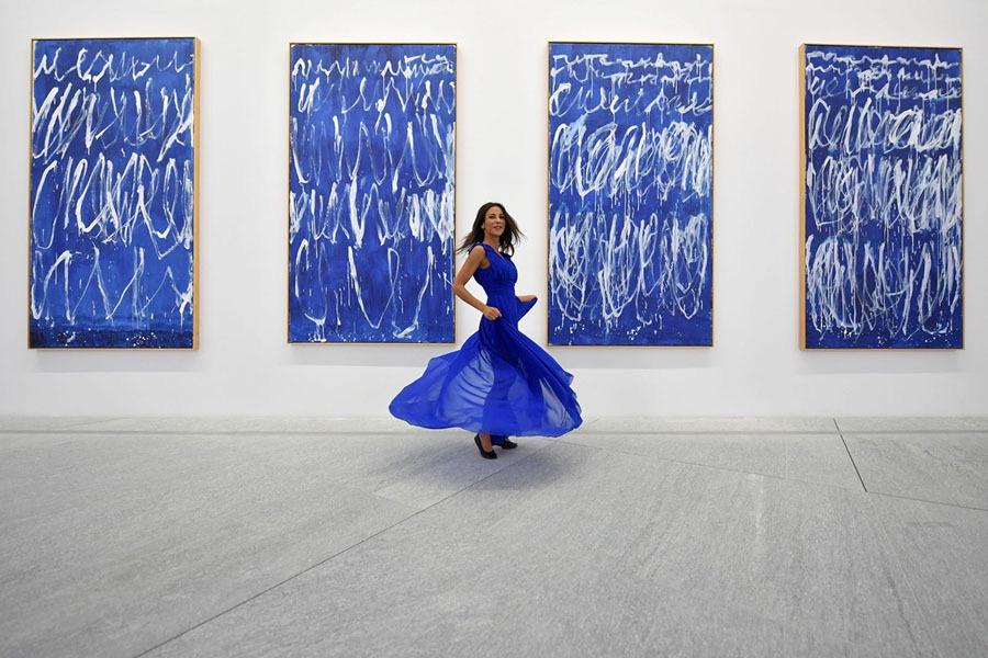 一位女士在画前摆造型。这是美国画家赛-托姆布雷(Cy Twombly)名为《无题I-IX》的作品。摄于2017年11月6日,媒体参观。