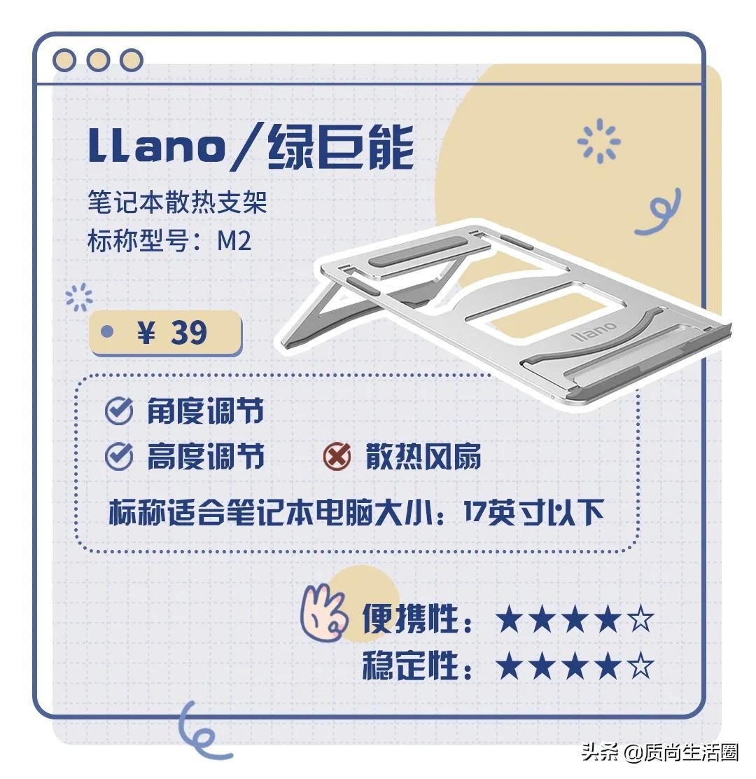 现在市场上笔记本支架的牌子多了去了,其实想买好一点的话,挑选松能Humanmotion、乐歌、宜家这些专注做办公用品的牌子就可以了。那么这些好的品牌到底选哪一个呢?这个就看自己需求了,虽然说东西都差不多,但是几个品牌的风格还是有一定差异,像我当初主要是想找一款轻薄颜值高、调节灵活易于携带的笔记本支架,一番筛选后选则了现在在用的松能Humanmotion。 本回答被提问者采纳如果经常在床铺上这样软垫子上操作,很有必要买一个散热底座,价格高低,果都差不多,散热比较鸡肋,只能改良2到5度温度,原因是5vUSB供电风扇排风量都不大,果就差。