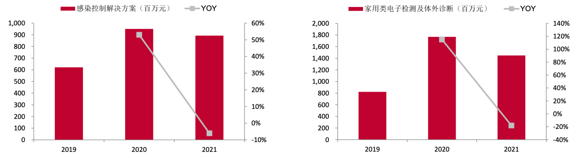 其中感染控制解决方案,实现收入8.93亿,同比-6.03%,占公司营收比14.13%;家用电子检测及体外诊断实现收入14.48亿,同比-18.11%,占公司总营收比达21%。