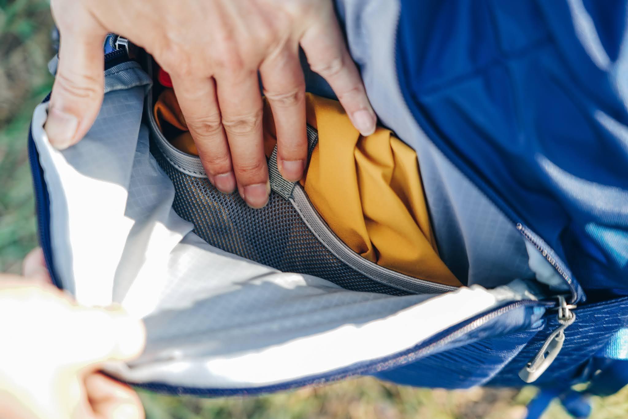 网袋里头还有一个大置物空间,打开上方拉链,里头还有网状隔间,我喜欢在这边放风衣、取水用的饮水袋,或是中午要吃的午餐。