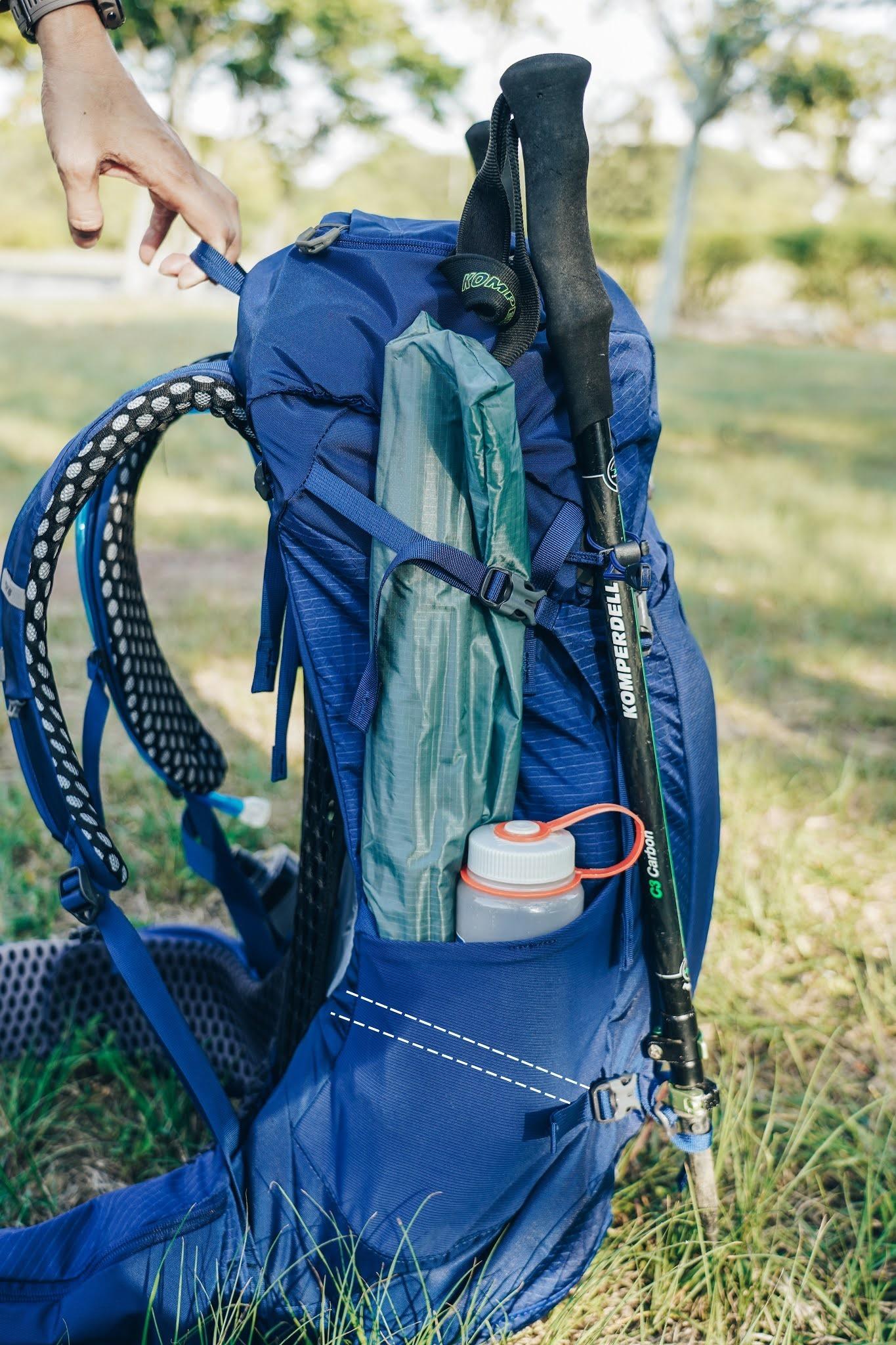 背包本体右侧是一个弹性网带,以及两条快扣压缩带。上方的压缩带外露,下方的压缩带则置于弹性网袋内(白色虚线处),如果要扎紧外挂的柱状物,例如帐篷帐杆、雨伞、登山杖等,可以做额外加强。网袋弹性、韧性都很好,塞两个水壶也没问题。