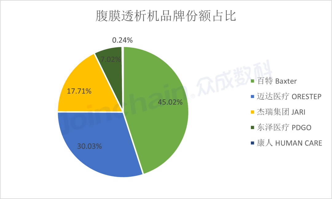 腹膜透析这一高端市场在血液、腹膜透析设备这一大类市场中份额低,在2021年中标金额份额中仅占0.4%,且以外资品牌为主。