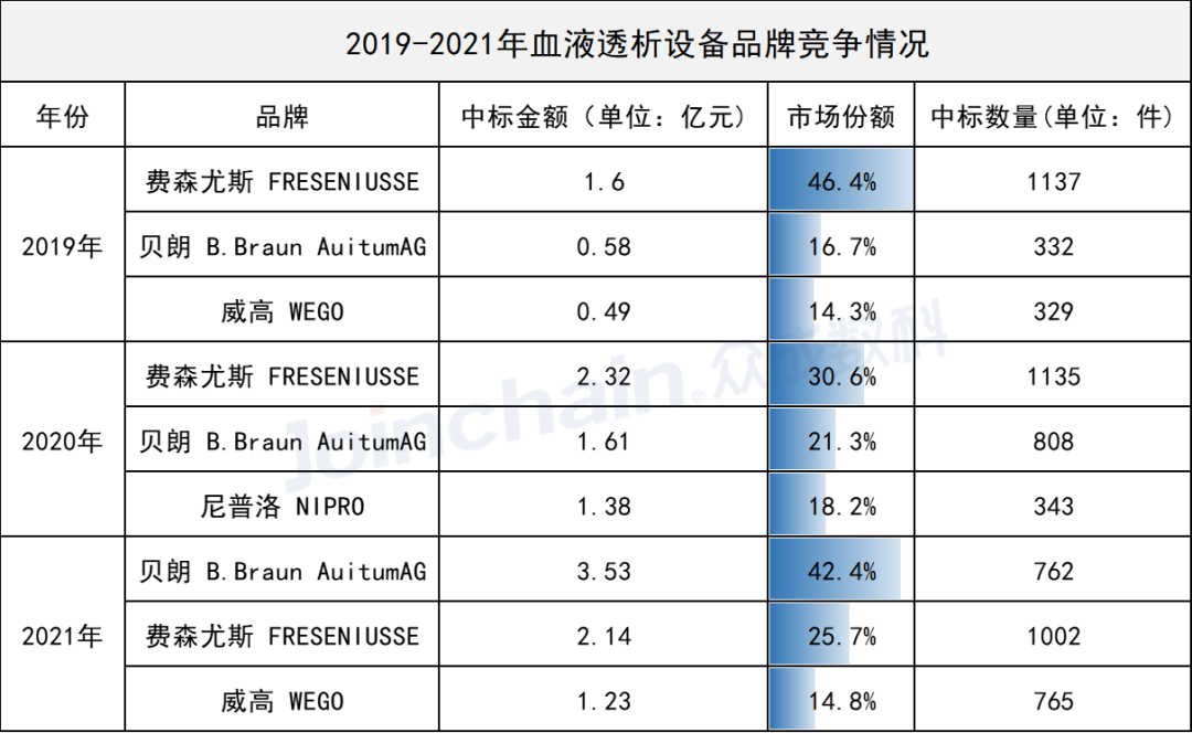 血液透析设备是血液透析市场的主角,占据了超过7成的份额。受限于高技术门槛,外资大厂产品一直是采购单位的主力,根据众成数科统计,2021年,传统五大外资厂商费森尤斯、贝朗、日机装、百特、尼普洛就占据国内血液透析设备市场超过8成份额。