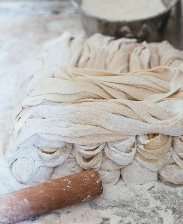 手工抻出的板面,比机器压面更加劲道耐嚼,煮在水里不易变成糊状。几根约莫一尺长半指宽的面片,一拨擀压出来,在案板上摔打、抻长,然后折合成两段,静待下锅。