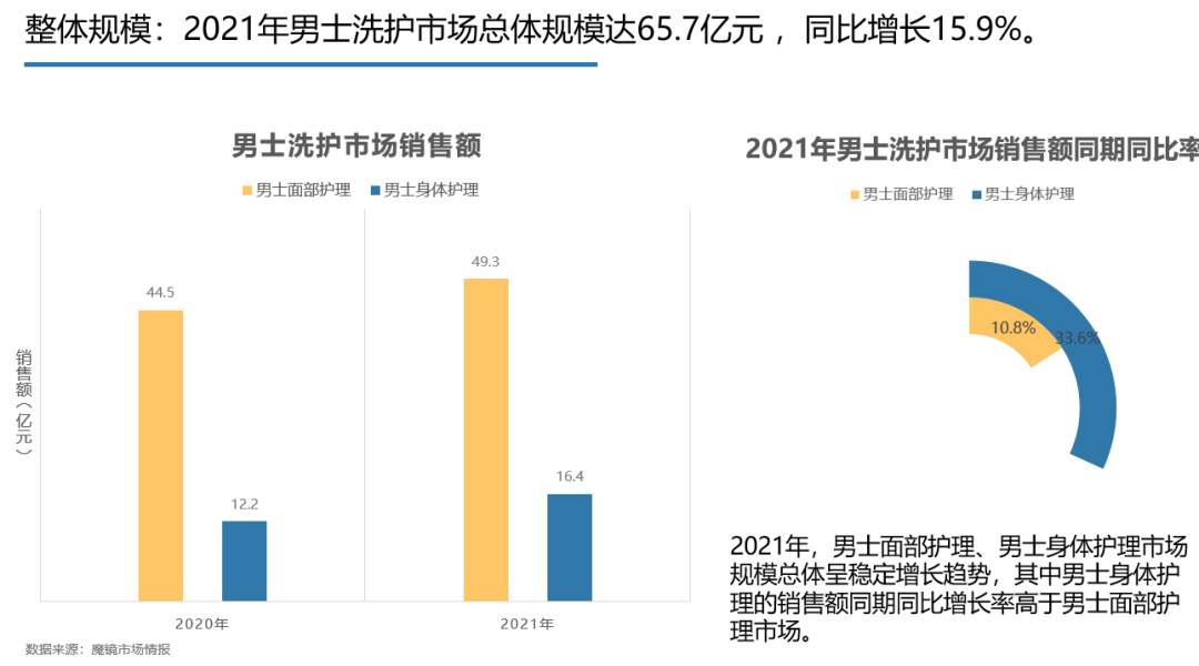 03 市场规模:男士洗护市场线上规模达65.7亿元,身体护理增长比面部护理快