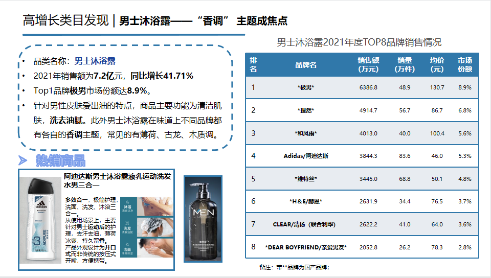 说完了男士洗护的重点品类,咱们再来看看市场中有哪些高增长品类值得关注。