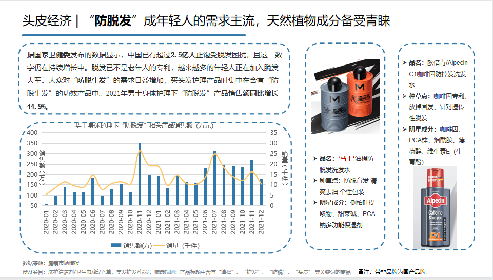 魔镜筛选了高增长概念趋势,发现“防脱发”、“防螨虫”、“美白提亮”和洗护产品的“气味”构成成为当下男士护理市场的热门趋势。