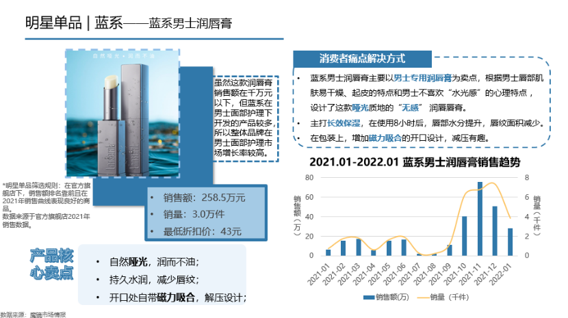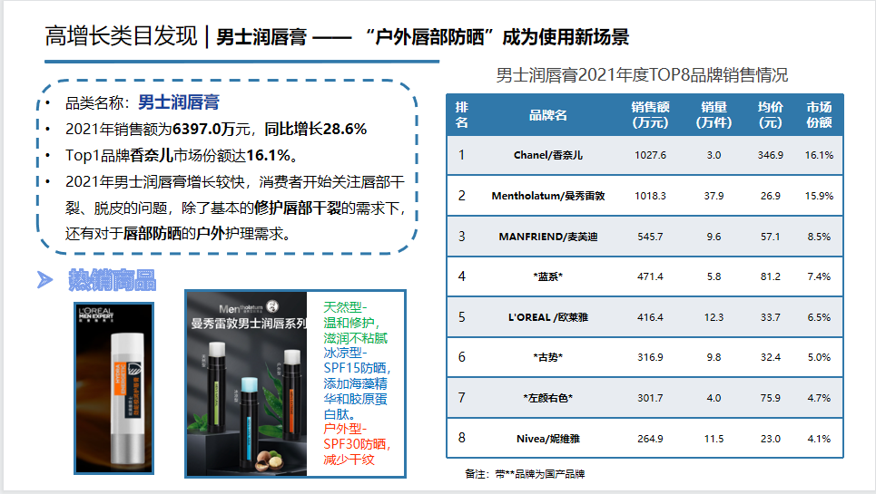 发现一个有趣的现象,随着户外运动的火热,男士户外润唇/防晒护理的需求增加,更哑光、低调质地的润唇膏获得男士喜爱。
